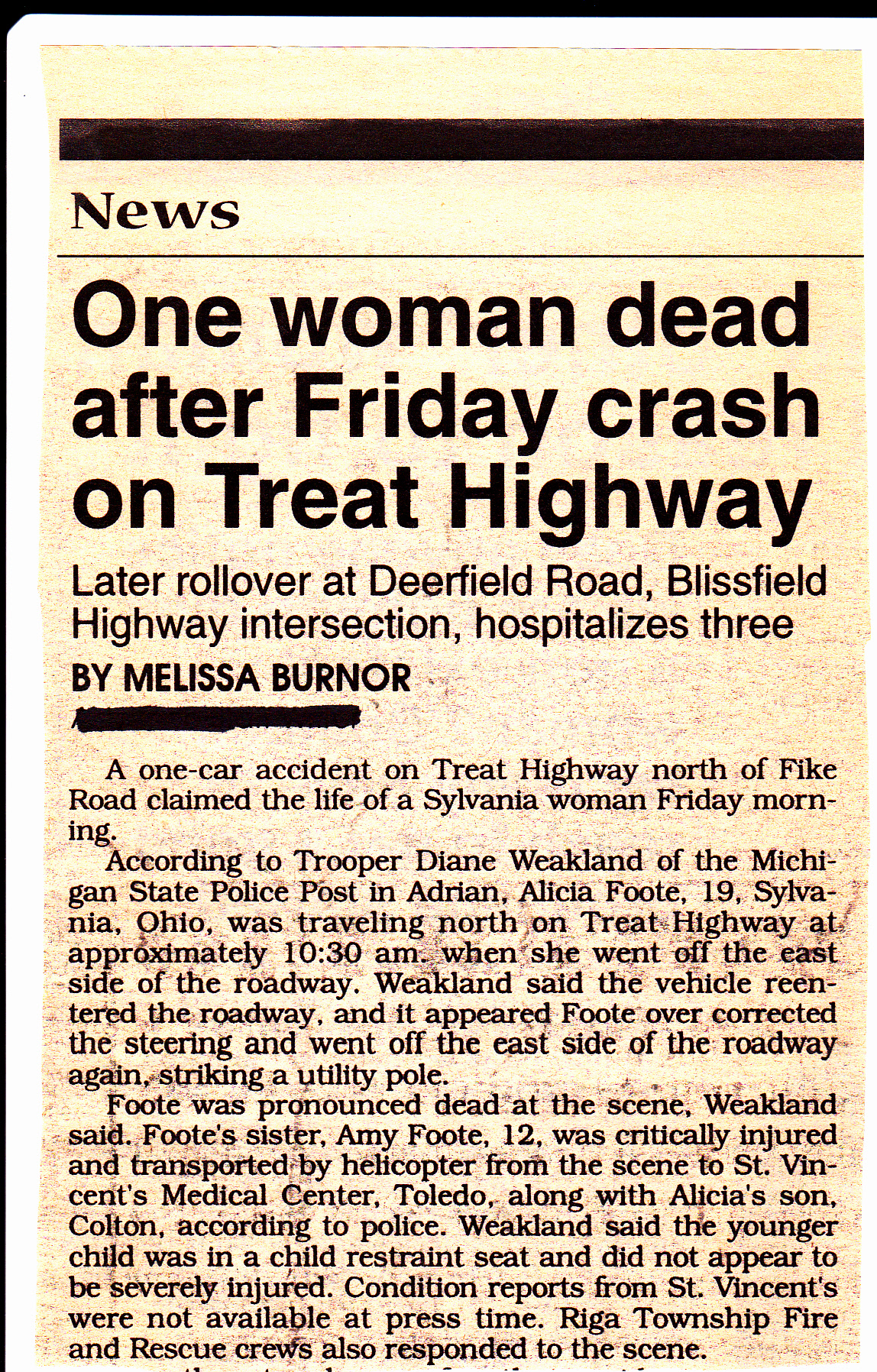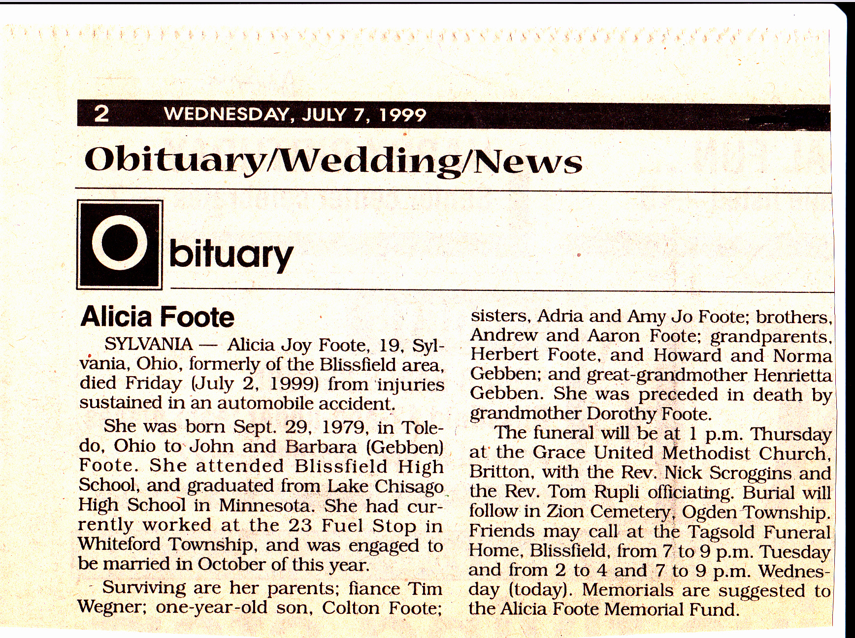 Being the Co-Editor of the school newspaper, I spent a lot of time working on the newspaper during class. But I also found time to flirt (badly) with freshmen boys. And I became friends with a couple of freshmen girls who were in the class. One of whom was Alicia Foote. She was short with long blond hair and the biggest smile. From how I knew her, she was one of the few truly nice people I have ever known. The phrase “heart of gold” comes to mind. In any century, it is hard to find a high school student you could say that about.