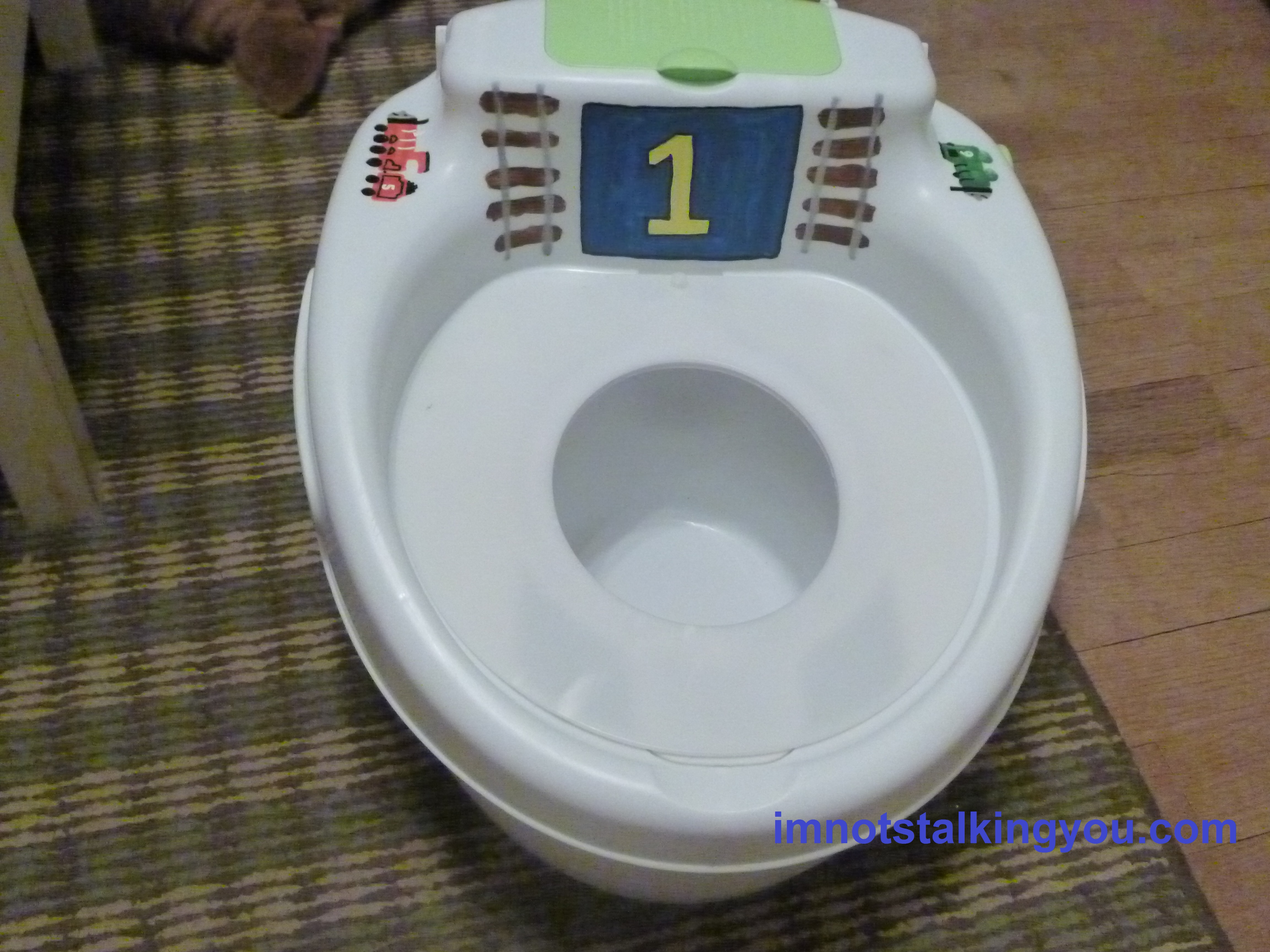 I used acrylic craft paint, if anyone is interested. I hope that it will withstand gentle sponge cleaning. I was originally going to paint the seat, but decided that would receive too much wear. I think it came out pretty good, since I free-handed it with no plan. And the #1 stands for Thomas, and a reminder of what goes in the potty!