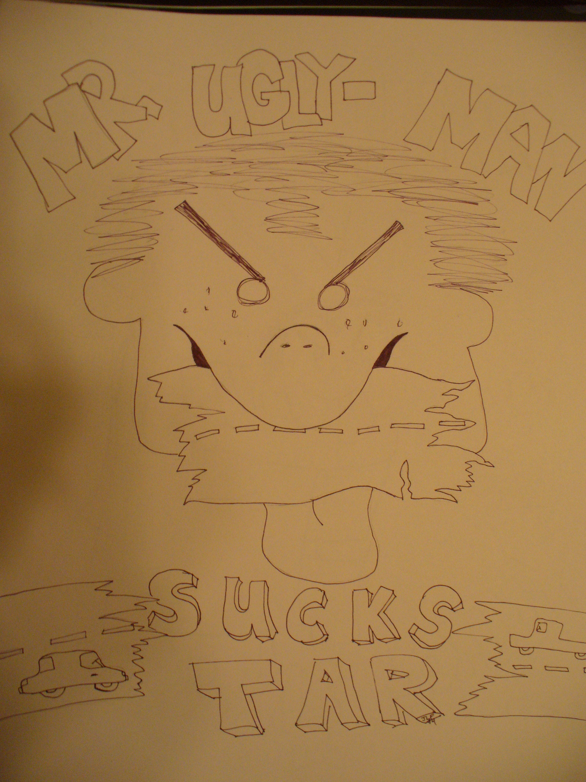 Mr. Ugly-Man is the cartoon character I created myself. I can draw him very quickly, like when I would see Charles M. Shultz draw Charlie Brown or Snoopy. Mr. Ugly-Man has no TV show or movie. Yet.
