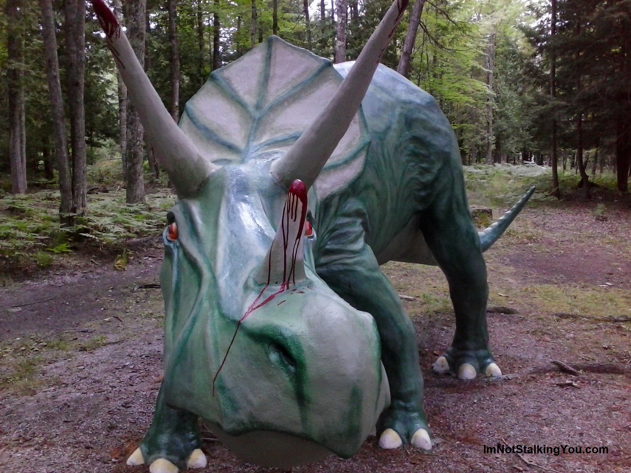 I didn’t tell my 4 1/2 year old son where we were heading. I had visited the Dinosaur Gardens website, but I was still afraid that maybe they would be closed or something. Then, of course, he was asleep when we arrived. I groggily took him out of the car and, holding him lovingly to me, said, “Hey, look what is over there in the woods!” and pointed out the giant brontosaurus to him.