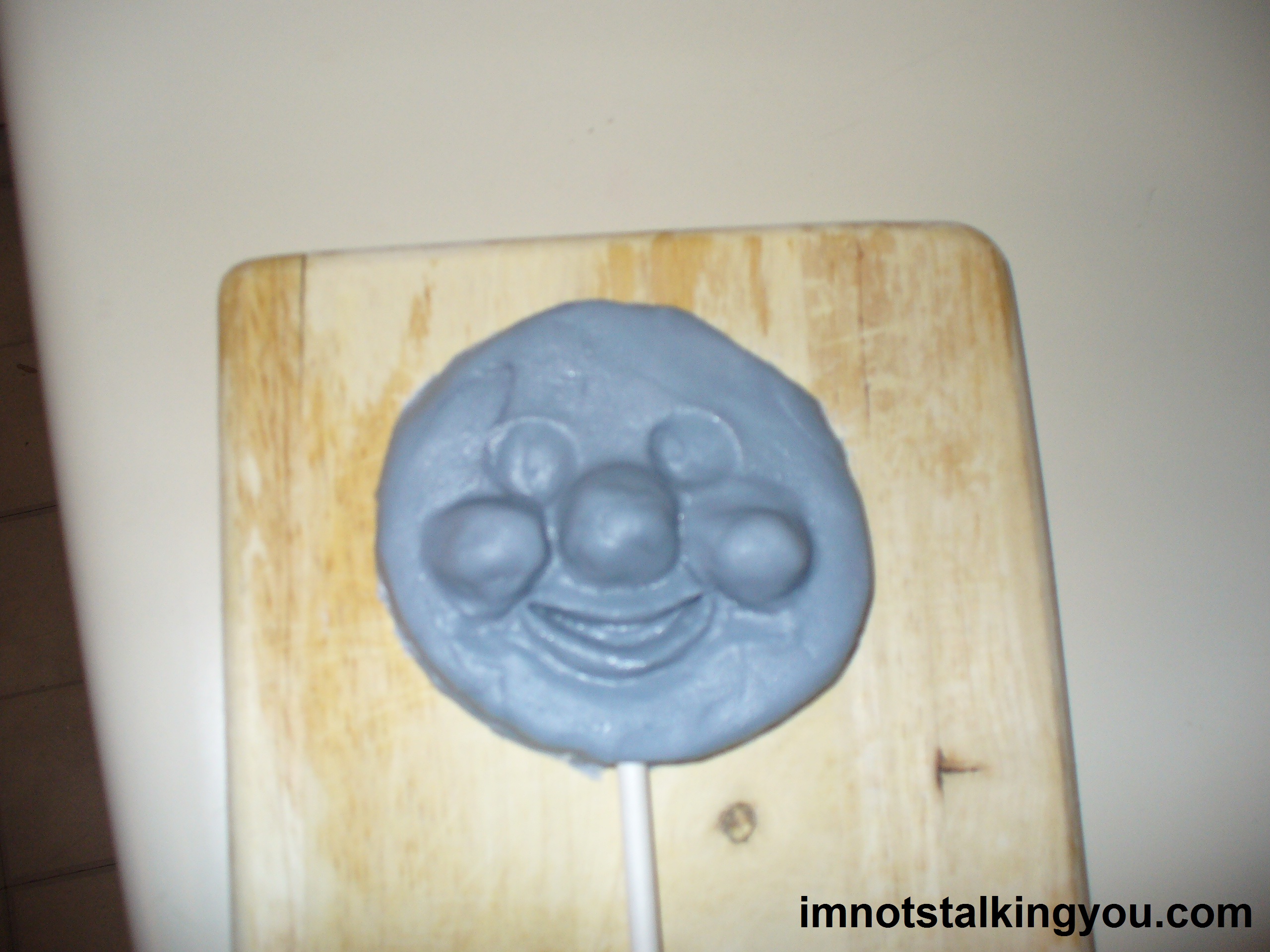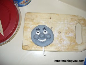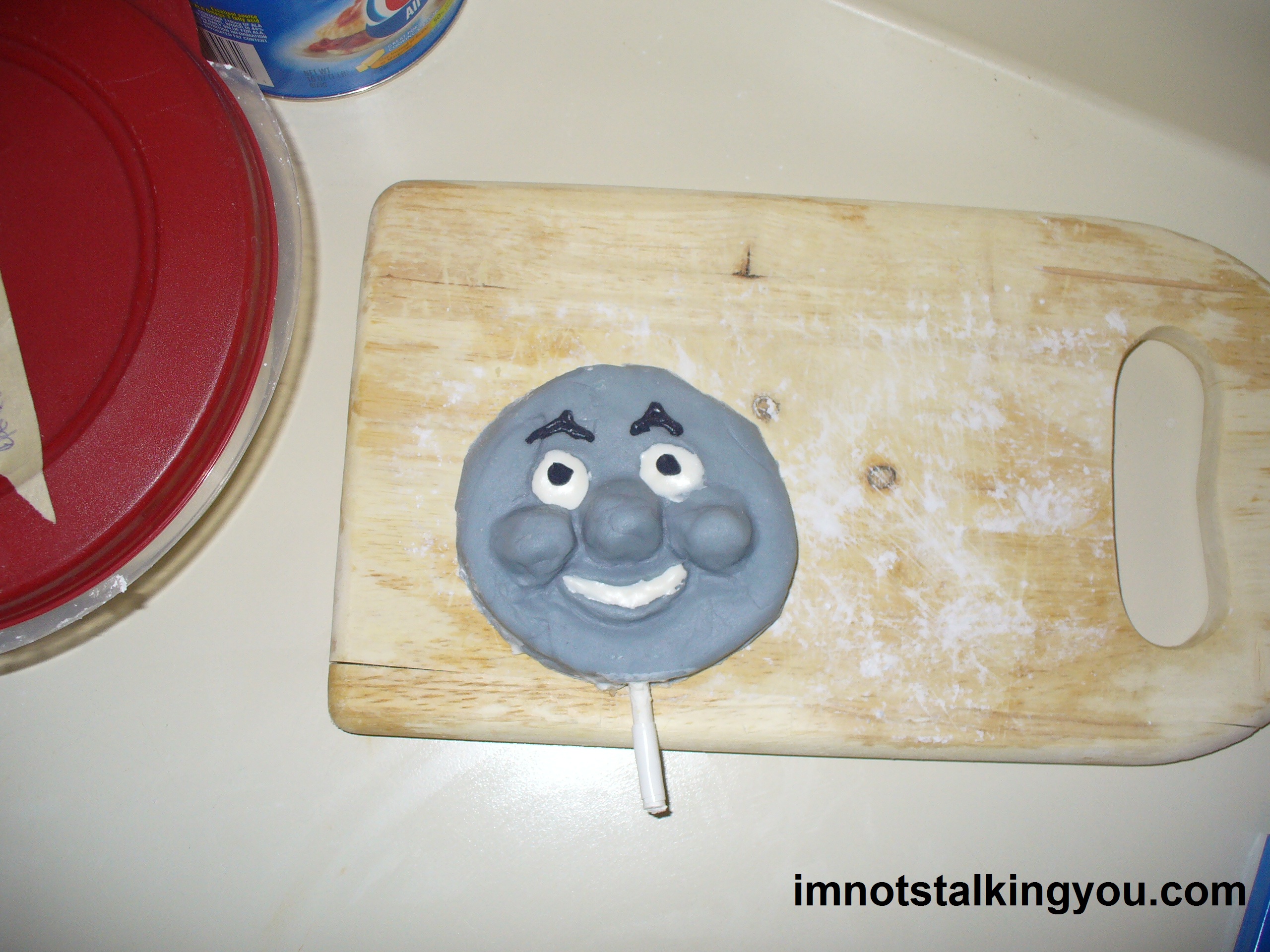 First I made Thomas’ face out of fondant. I didn’t want to have to color my fondant to be blue later (which would have been impossible anyway), so I only purchased blue fondant. I knew that after adding black, the face would look gray and not blue. I was sure to put the stick in before the face dried. Because I was being cheap and didn’t buy any white fondant, I finished the eyes, mouth, and pupils later with buttercream icing. I made the face on Tuesday for a Saturday party.