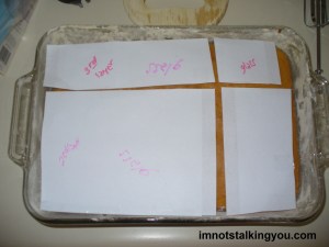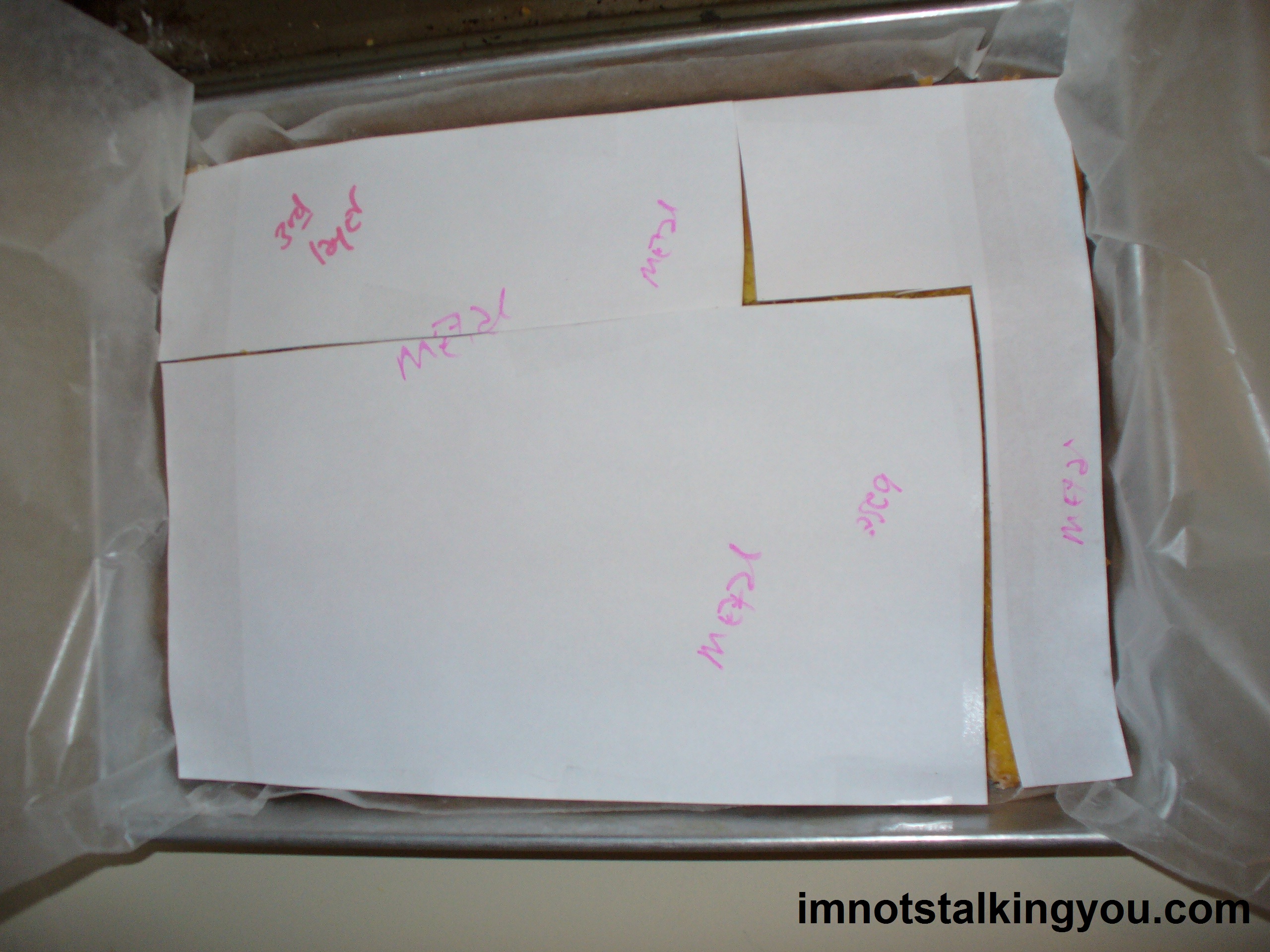I don’t have a sheet cake pan, so I baked two 9″X13″ cakes. I created paper patterns ahead of time to visualize how I would stack my four layers. I used these patterns to score the cakes before I put them into the freezer, wrapping them in wax paper, then covering with several layers of foil. I baked and froze the cakes on Wednesday for a Saturday party.