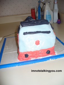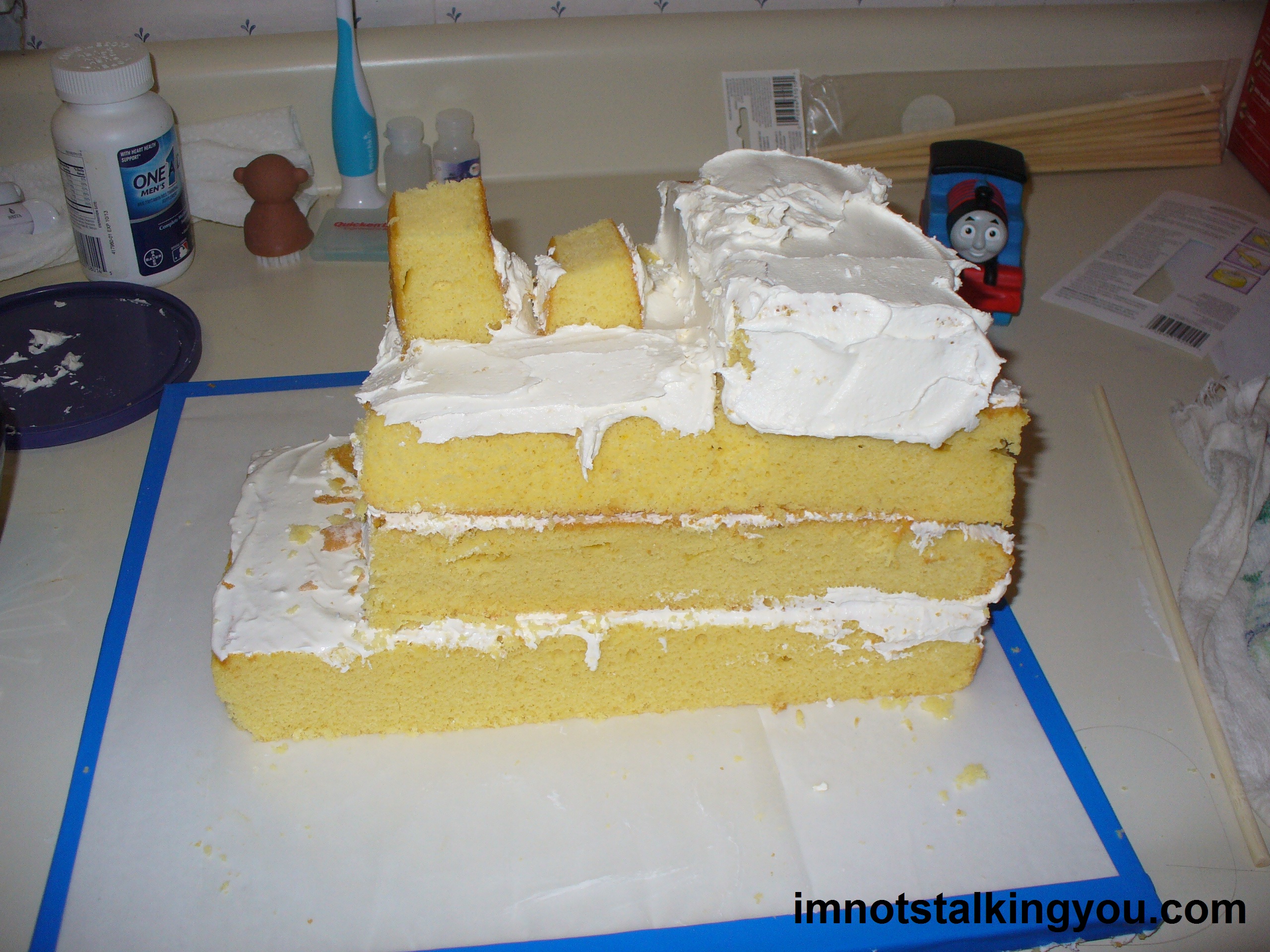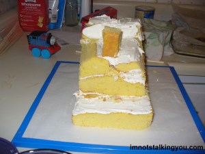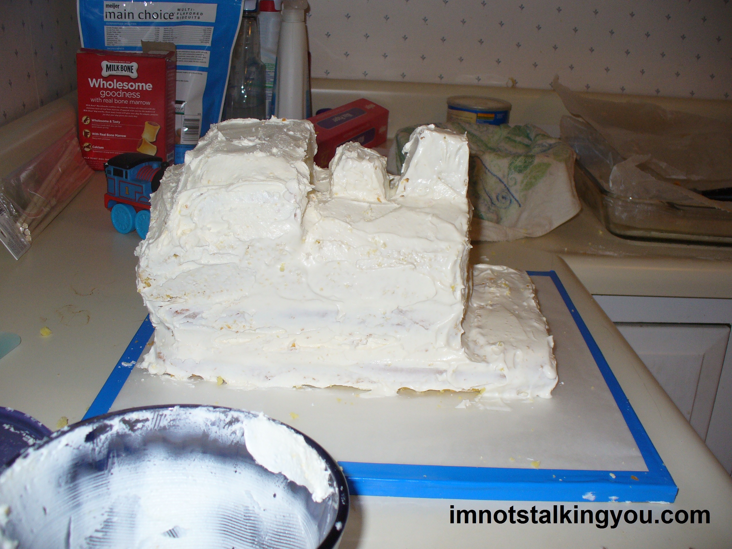 Once I came up with this idea in my head, I just knew that a flat sheet cake with a Thomas picture or toy on it just wasn’t going to do. I must give credit where it is due. I would never have attempted this if I had not found a great Thomas tutorial online by Wendy Lindsey at http://thomasthetankenginecake.blogspot.com/ .