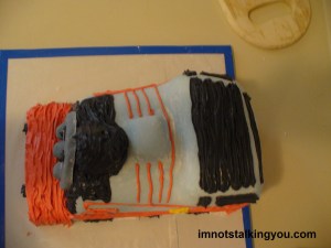 I just decided what details were important to me to include and which weren’t. I actually put in more than I had planned. Being budget conscious and lazy, I also tried to control the amount of colors I needed to use. I only decorated with black, red, and yellow. The wheels on the toys I have are actually blue, but I liked the ones on the cake as black (and I didn’t have to mix up any blue!).