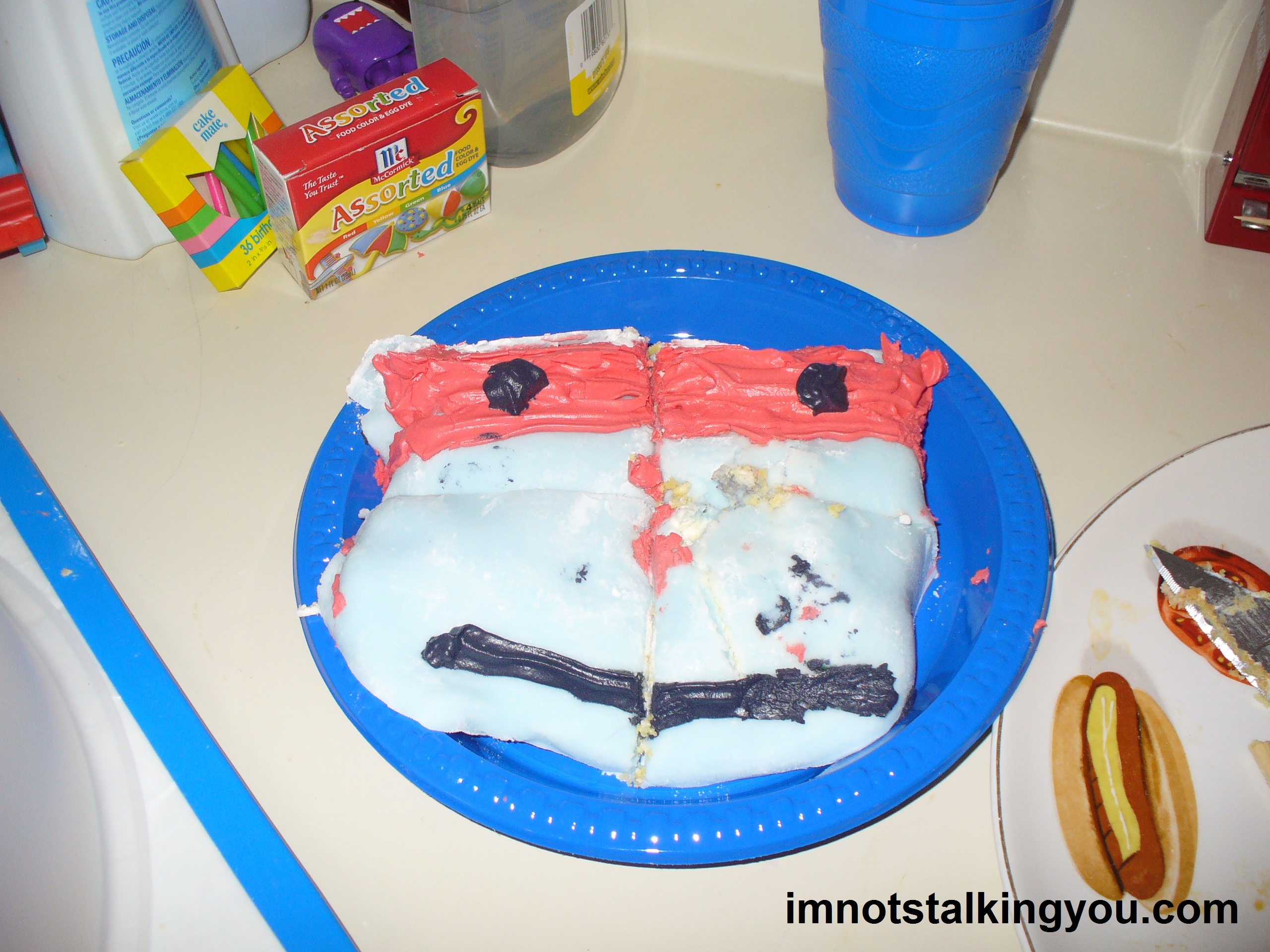 I was afraid to put the face on because I thought the weight of it would make it fall forward into the red frosting. I didn’t buy any piping gel (which I was supposed to use to stick on the face), so I just used buttercream frosting instead. It stayed on just fine!