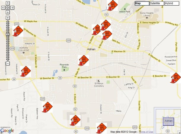 A map of Adrian showing the construction projects of 2012, as compiled by me.